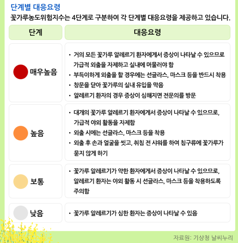 기상청 날씨누리에서는 꽃가루 농도위험지수를 분류하고 단계별 대응요령을 안내해줍니다.