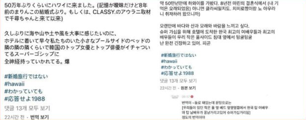한 일본인 관광객이 "호텔에 도착하니 작은 수영장 옆에 옆에 옆에 한국의 톱 여배우와 톱 남배우가 꽁냥꽁냥대고 있다"라며 "수퍼 가십에 긴장된다"라고 SNS에 글과 함께 "응답하라 1988"과 "알고있지만"을 태그하며 기사화되었습니다. 그 기사로 일파만파 스캔들이 퍼졌습니다.