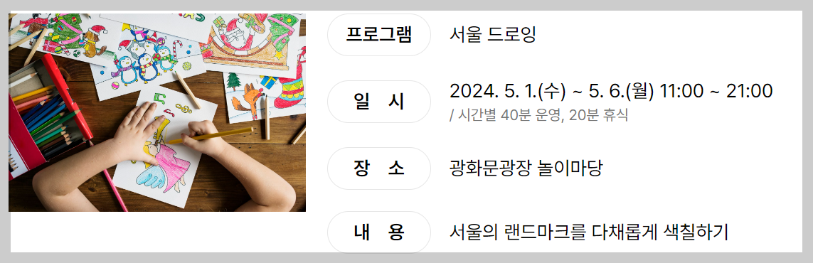 일 시 - 2024. 5. 1.(수) ~ 5. 6.(월) 11:00 ~ 21:00 (일부 프로그램 5. 4.(토) 미운영)