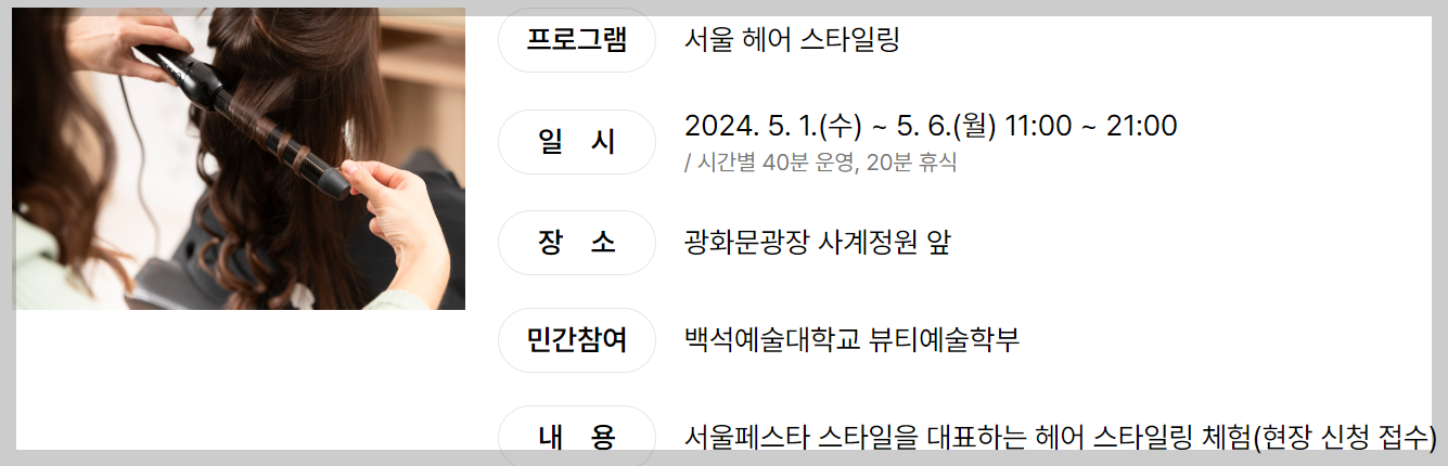 뷰티존에서는 헤어 스타일릉 체험을 하는 '서울 헤어 스타일링', 포인트 메이크업과 키즈 메이크업을 체험하는 '서울 메이크업', 네일아트 체험 및 셀프 네일아트 존인 '서울 네일아트', 포토 그래퍼가 화보 촬영을 해주는 '서울 페스타 화보촬영' 이렇게 4가지가 운영이 됩니다.