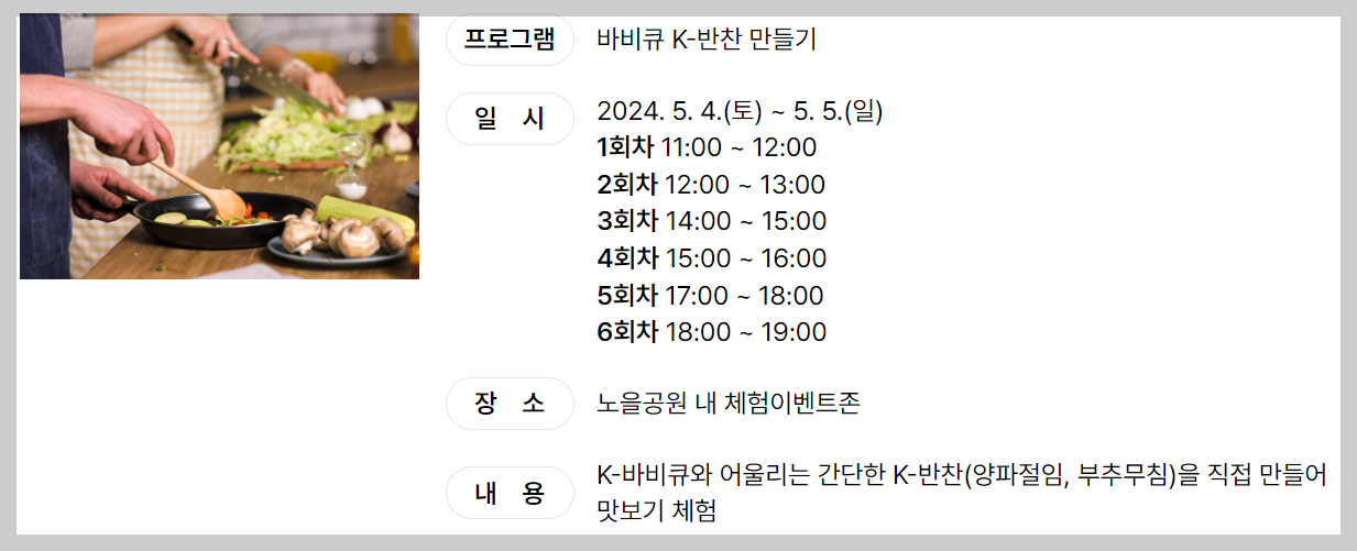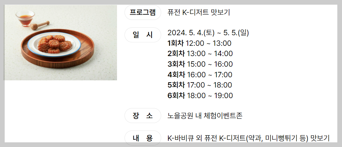 체험이벤트존에서는 체험이라는 이름에 걸맞게 직접 만들어보고 맛보는 프로그램 세 가지가 준비되어 있습니다. '바비큐 K-반찬 만들기', '전통 K-디저트 맛보기', '퓨전 K-디저트 맛보기' 프로그램의 자세한 내용과 일시는 아래를 참고해 주시기 바랍니다.