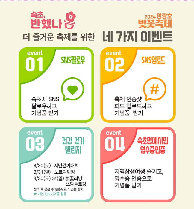 ‘속초, 반했나 봄’을 부제로 4가지 봄 테마 행사가 진행됩니다. 벚꽃 개화가 늦어짐에 따라 만개가 예상되는 4월 6일부터 7일에 일부 포토존, 야간 조명존, 친환경 체험 및 버스킹 공연이 한 번 더 운영됩니다.