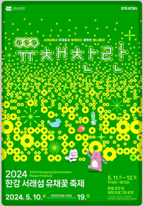 2024 한강 서래섬 유채꽃 축제가 5월 10일부터 19일까지 10일 동안 반포한강공원 서래섬에서 개최됩니다. 유채꽃밭 곳곳에서 유채꽃을 즐기며 특별한 사진을 찍을 수 있는 ‘유채찬란’ 포토존은 기간 중 상시 운영되고, 첫 주말인 5월 11일부터 12일까지 2일간 특별 공연 및 다양한 체험 프로그램이 진행됩니다.