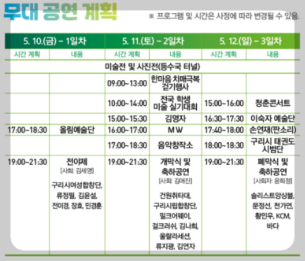 이번 축제에는 잔디광장 특설 무대에서 지역 예술인과 유명 가수들이 출연해 분위기를 고조시킬 것이며 구리전통시장과 중소기업 제품 홍보부스를 운영하여 지역경제활성화를 도모할 것이며 각종 먹거리 부스와 푸드 트럭 등 먹거리도 풍부하게 준비될 예정입니다.