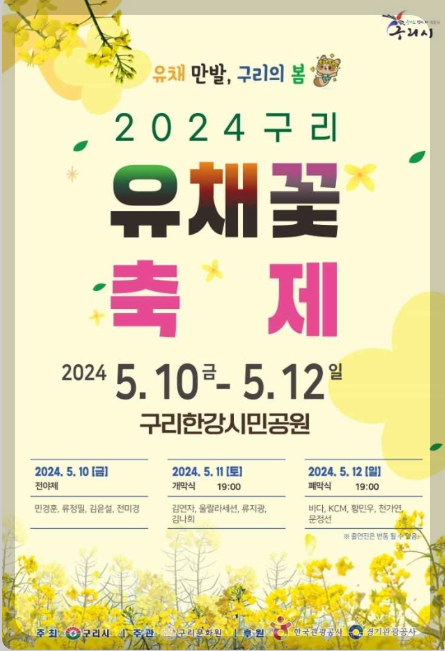 구리시를 대표하는 봄축제로 한강 최대 꽃단지인 구리한강시민공원에 봄꽃이 만발하여 대자연의 장관을 만끽할 수 있습니다.